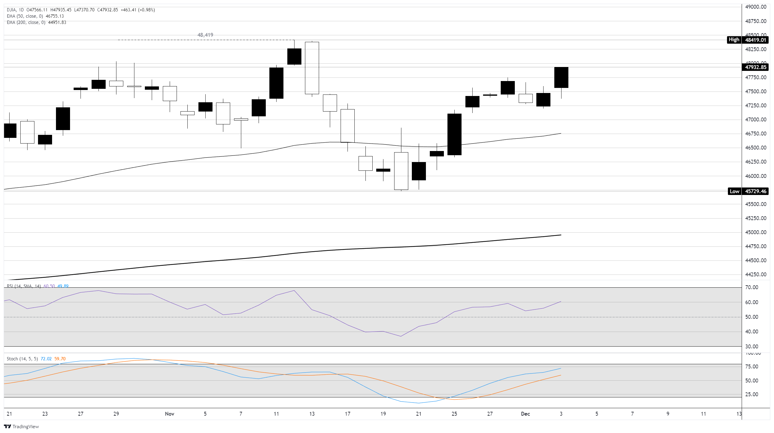 道琼斯工业平均指数(DJIA)在周三上涨450点,市场对美国经济表现不佳的乐观情绪重新点燃,预计美联储(Fed)将被迫在12月进行第三次连续降息。由于ADP就业数据大幅收缩以及微软(MSFT)人工智慧销售部门的下调修正,股市早盘出现了看跌倾向,给股市交易者带来了沉重打击。然而,面对崩溃的劳动力市场,另一次降息25个基点的希望点燃了周中市场交易的看涨情绪。