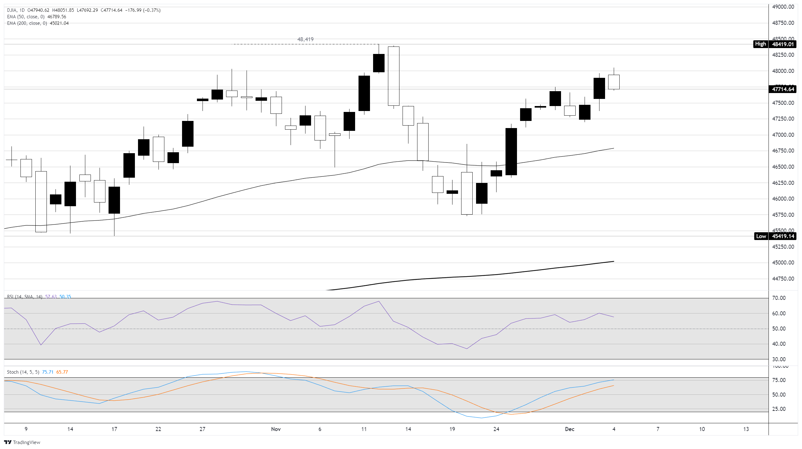 道琼斯工业平均指数(DJIA)在周四附近徘徊在48000点附近,随后回落约100点。股市在交易周后半段放缓了动能,投资者的关注点完全集中在下周即将公布的美联储(Fed)利率决策上。