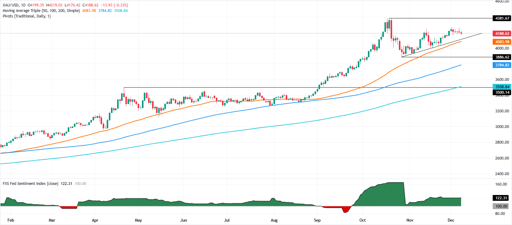如果XAU/USD重新升回$4,200,预计将测试$4,250和$4,300。突破后者将暴露出历史高点$4,381。相反,跌破接近$4,144的20日简单移动均缐(SMA)将清除通往$4,100和50日SMA($4,076)的路径。