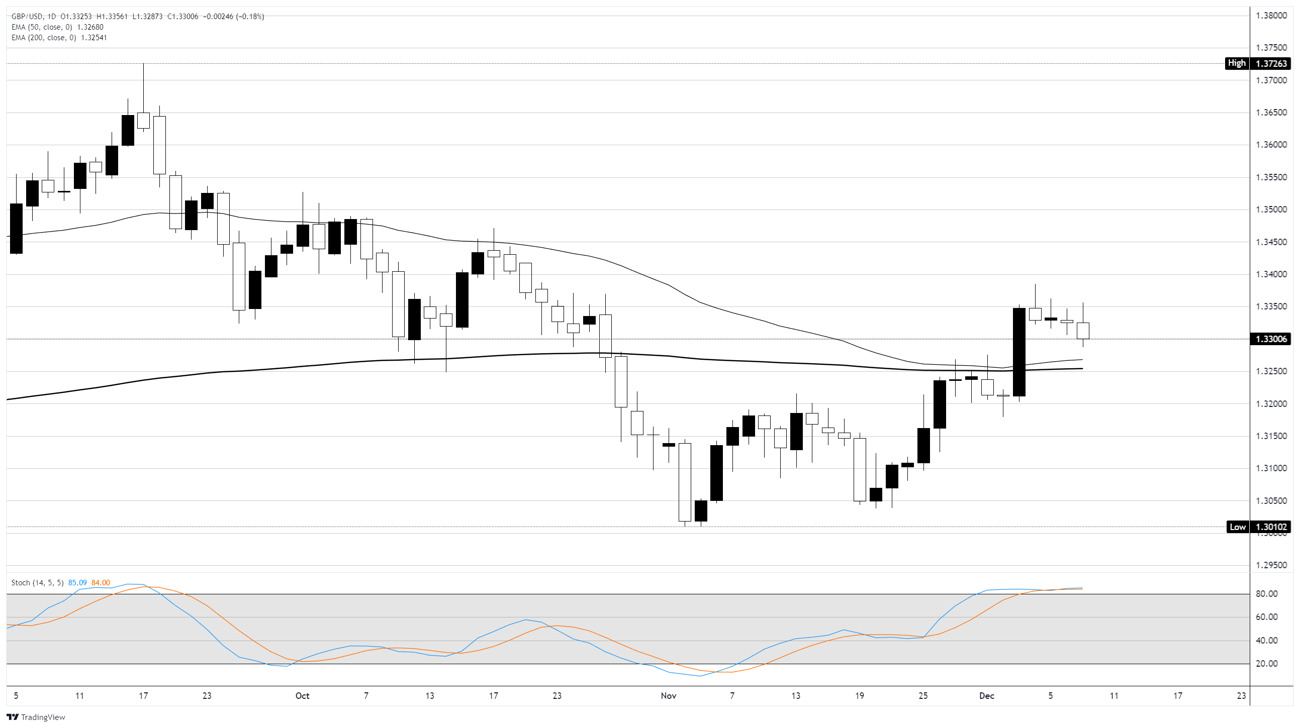 英镑/美元周二回落至中间区域,因在1.3350水平遭遇日内技术性拒绝,价格行动下滑约0.2%。价格已回落至1.3300附近,并保持在长期200日指数移动均缐(EMA)1.3250附近,市场為2025年最后一次美联储(Fed)利率决策做好准备。