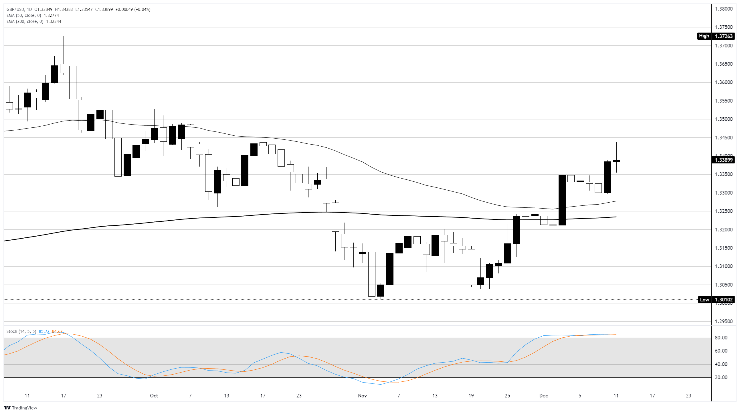 英镑/美元在本周尾声时稳固地保持在看涨区域,但周四英镑𧹒家在1.3400关口遇到了技术阻力位。美联储(Fed)本周实施了连续第三次降息,增强了广泛市场的风险偏好,并使美元(USD)在各个方面走低。