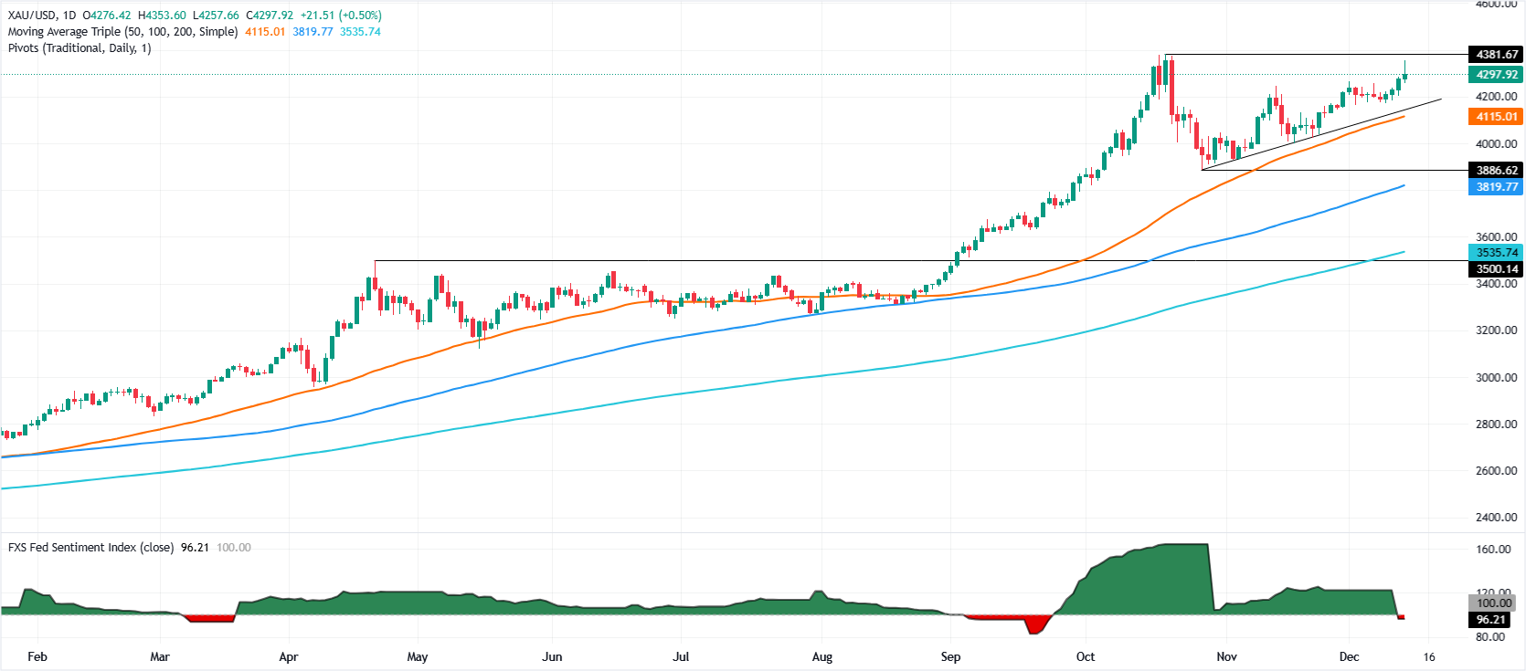 黄金(XAU/USD)在周五小幅上涨,交易者似乎在周末前锁定利润,但在达到七周高点4353美元后仍保持超过0.51%的涨幅。截至发稿时,XAU/USD交易于4302美元,交易者正在消化美联储(Fed)官员的评论。
