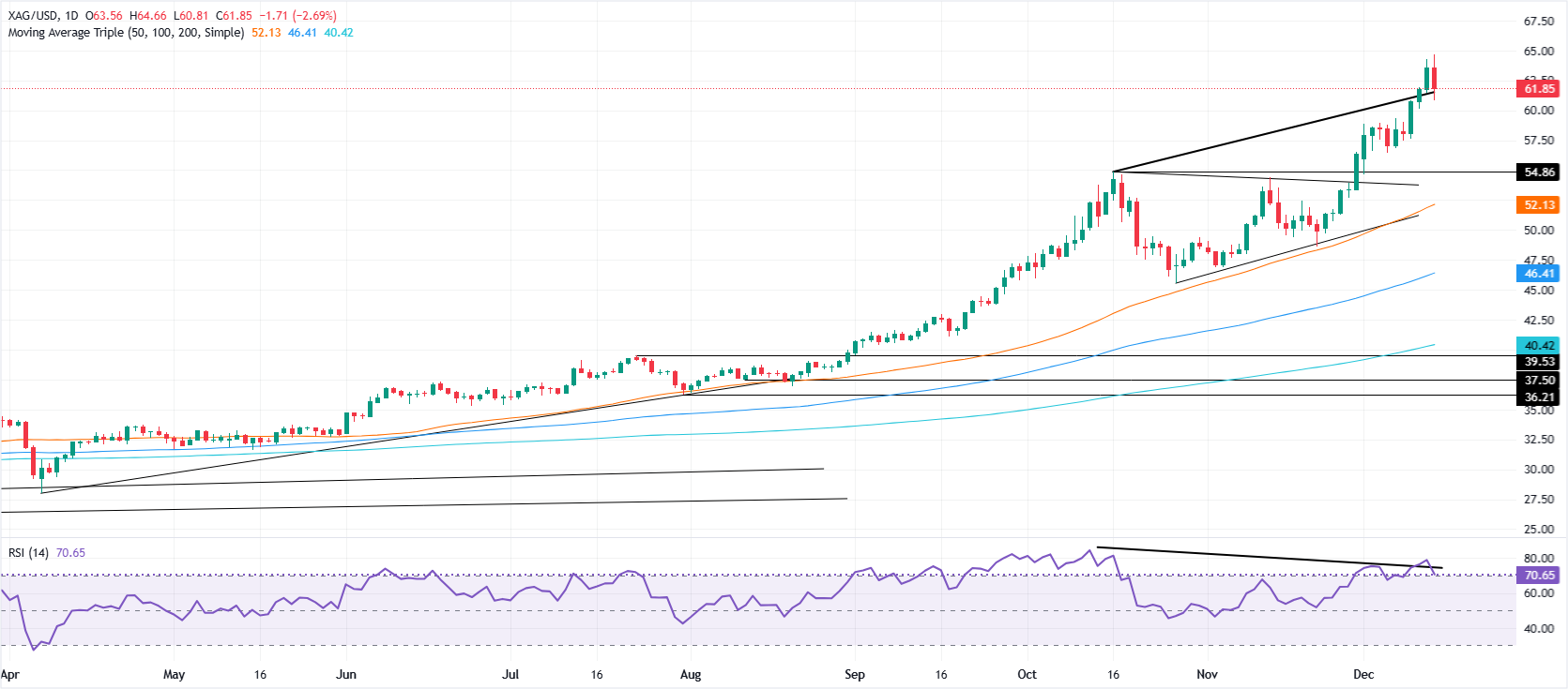 相反,如果XAG/USD突破62.00美元,预计将再度上涨,下一阻力位為12月11日的高点64.30美元,随后是创纪录的64.65美元。