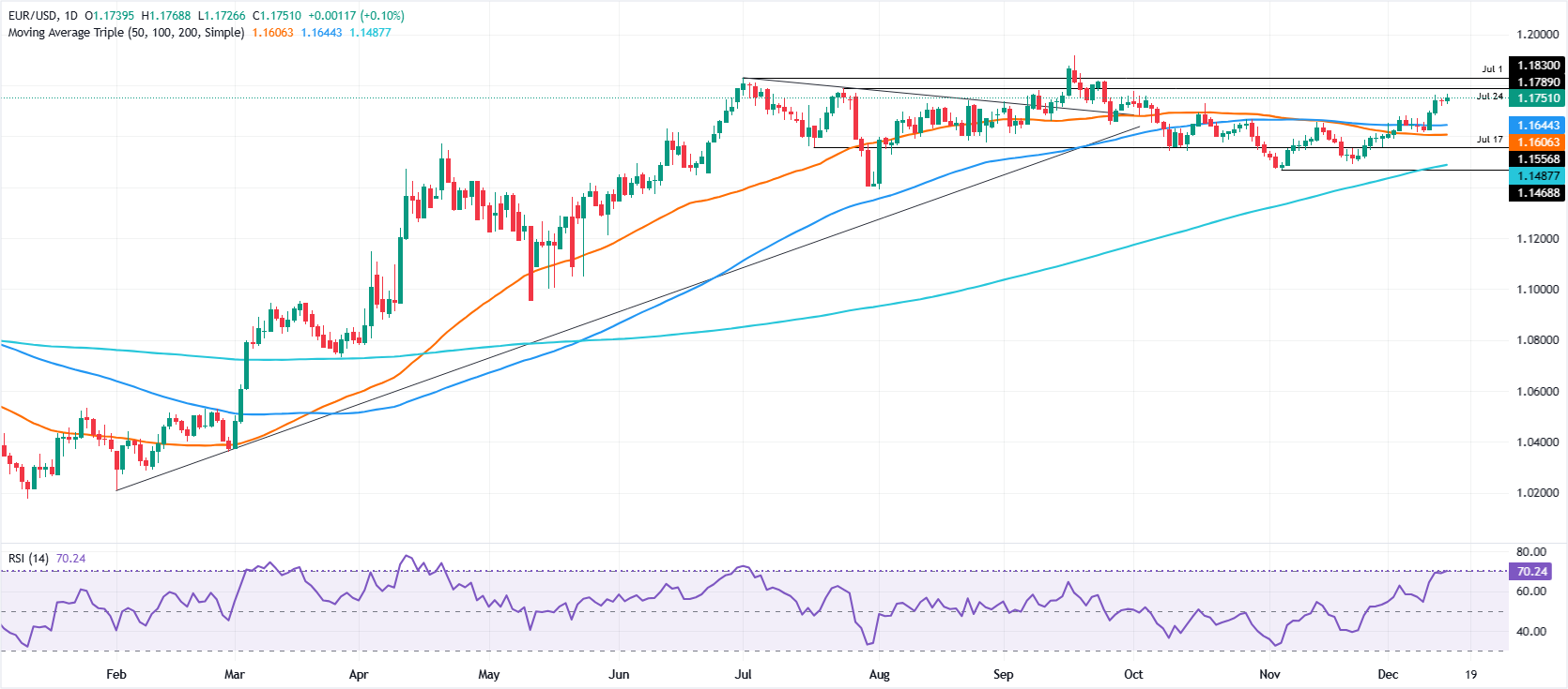 - 欧元/美元在美元走弱的情况下交易于1.1739,美元指数(DXY)在四个交易日中第三次下跌。