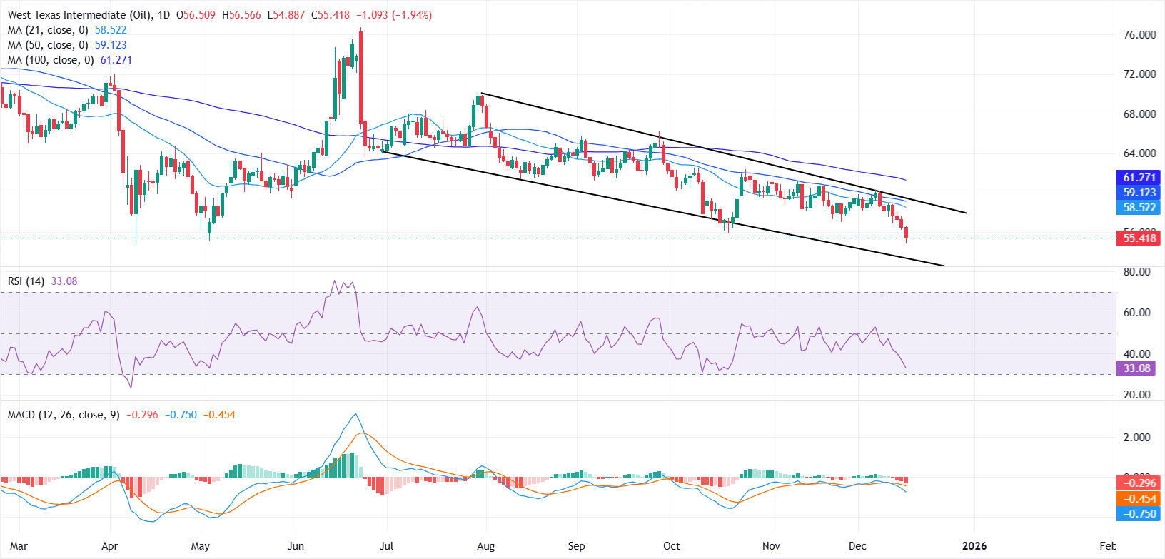 WTI 在日缐图上交易于其关键移动平均缐下方,进一步强化了当前的看跌偏向,同时价格徘徊在年内低点附近,使下行风险加大。