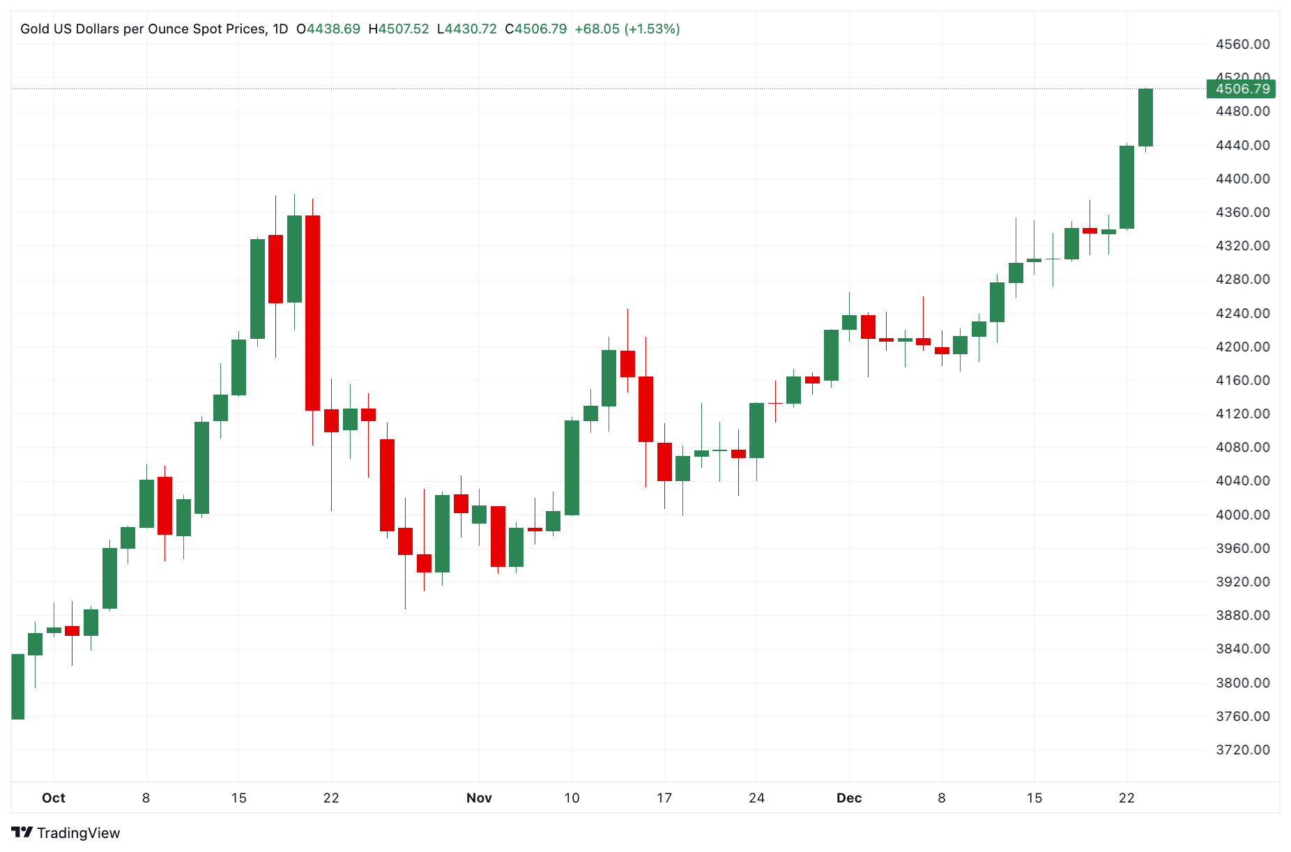 黄金(黄金/美元)在周三亚洲时段上涨,触及4505美元的历史高点。由于以色列-伊朗冲突和美国-委内瑞拉紧张局势的加剧,贵金属的避险需求得到提振。