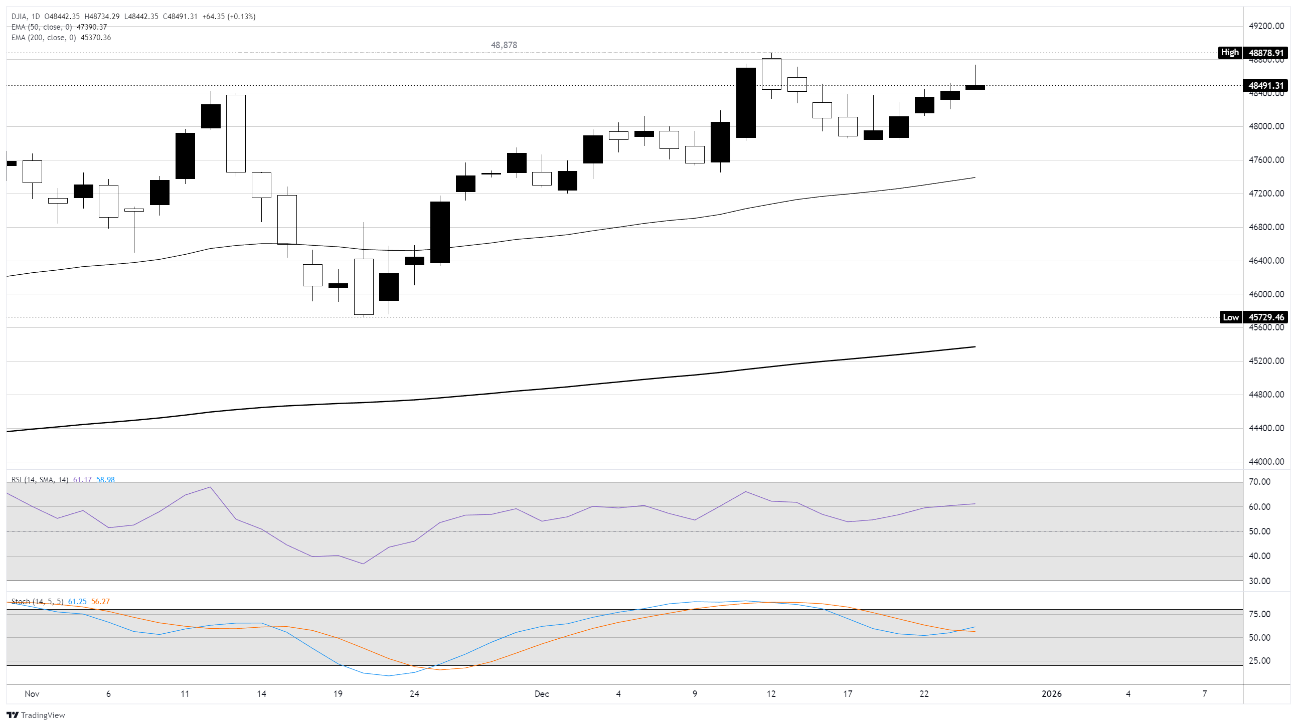 主要股指在年末交易量极低的情况下,努力寻找上涨动力。标准普尔500指数(SP500)在隔夜交易中触及盘中历史新高,但最终回落至平盘,受到人工智慧科技反弹空间再次减弱和建筑材料板块下滑的影响。道琼斯指数在隔夜交易中也曾上涨,但从上周五的收盘价回落,仅上涨了100点,因英伟达(NVDA)股价下跌1.7%而削弱了上涨动能。