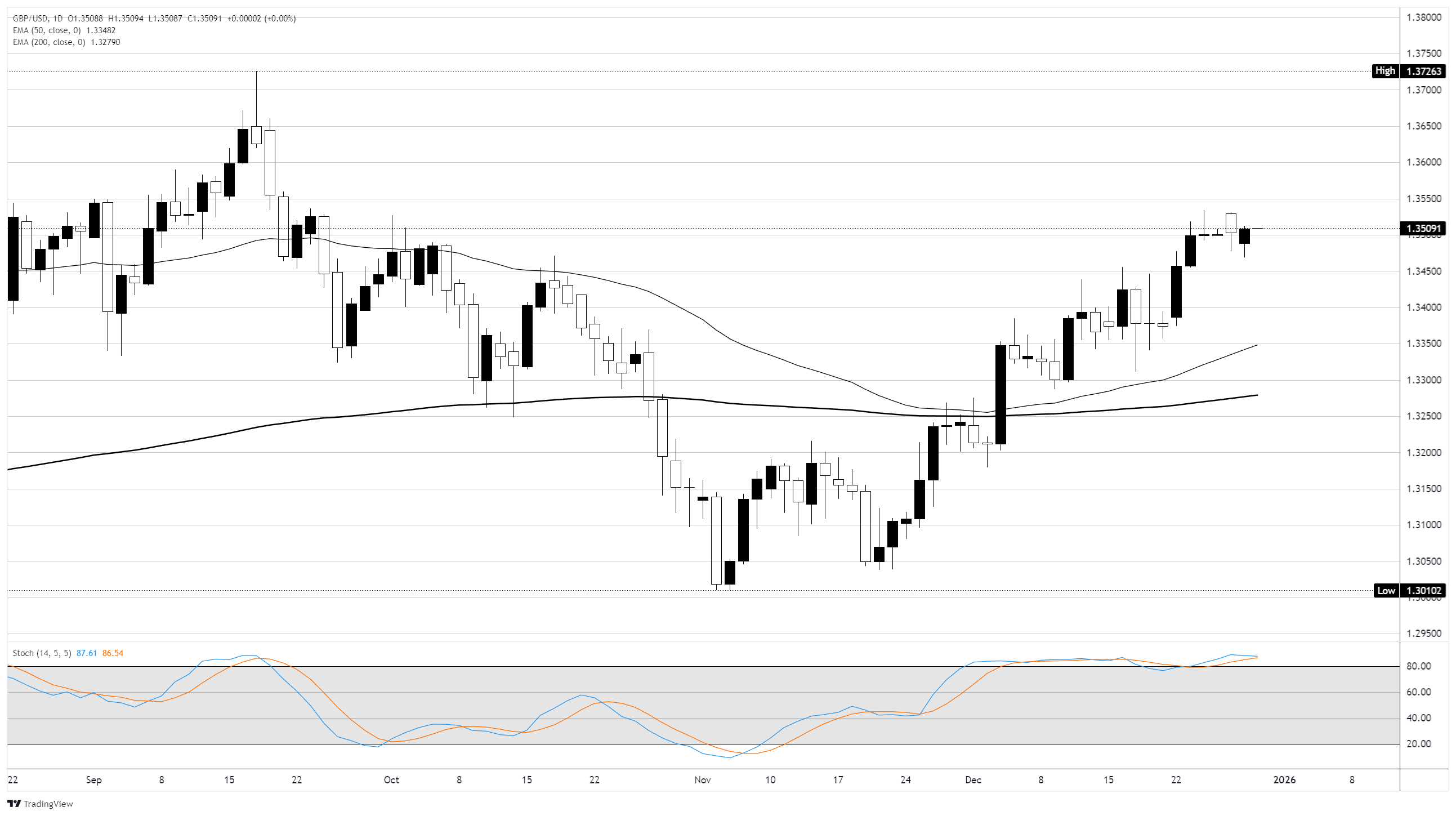 英镑/美元在年末最后一周的交易中保持在高位。侭管年末假期交易量不太可能在任何方向上取得显著进展,但英镑仍然保持看涨倾向,使价格走势维持在1.3500的高位。