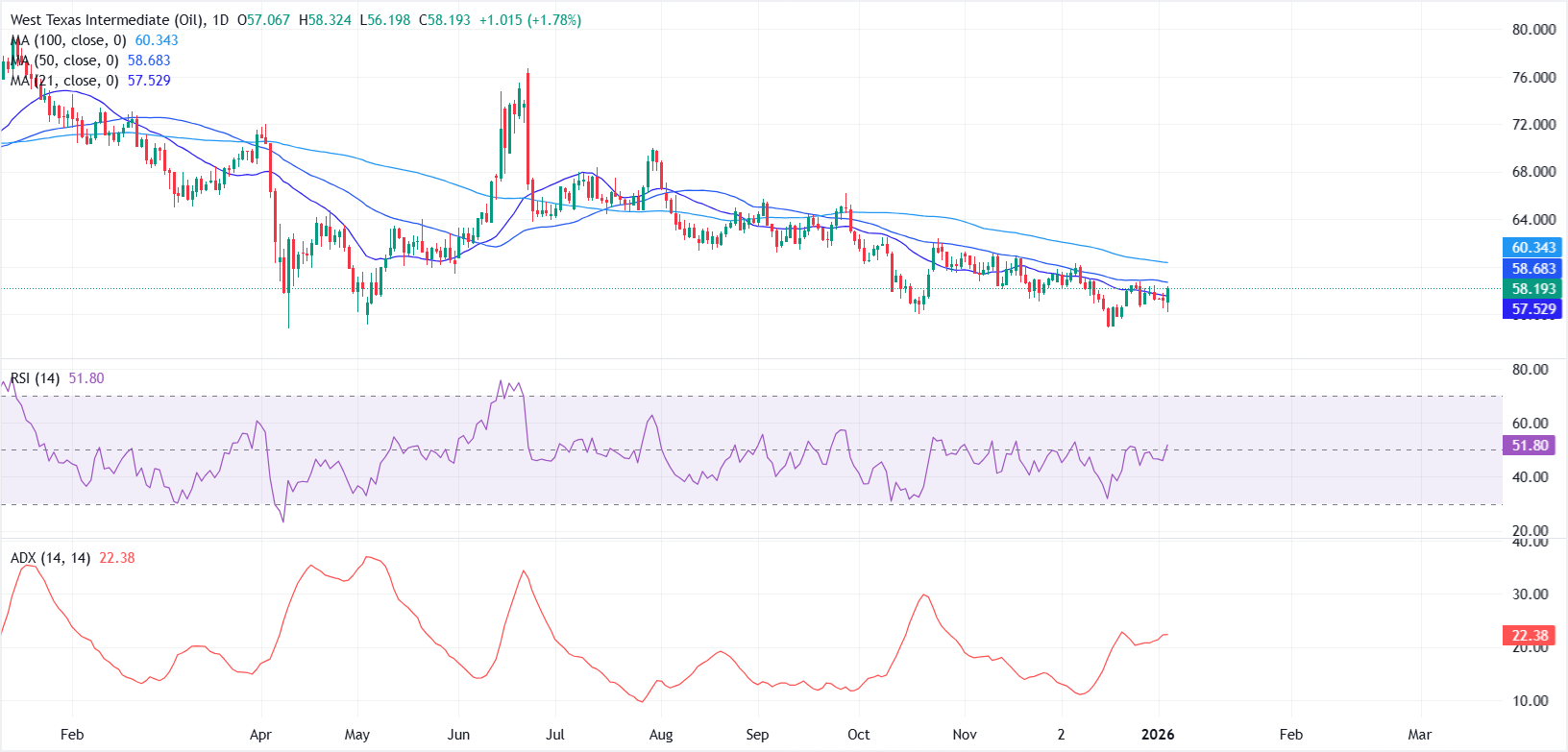 截至撰写时,WTI交易价格约為每桶58.00美元,此前在欧洲时段早些时候曾跌至56.19美元的两周低点。