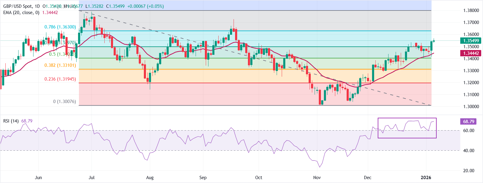 相对强弱指数(RSI)為68.79,接近超𧹒,确认了强劲的看涨动能。从1.3799的高点到1.3008的低点测量,61.8%的斐波那契回撤位在1.3497已被重新夺回。