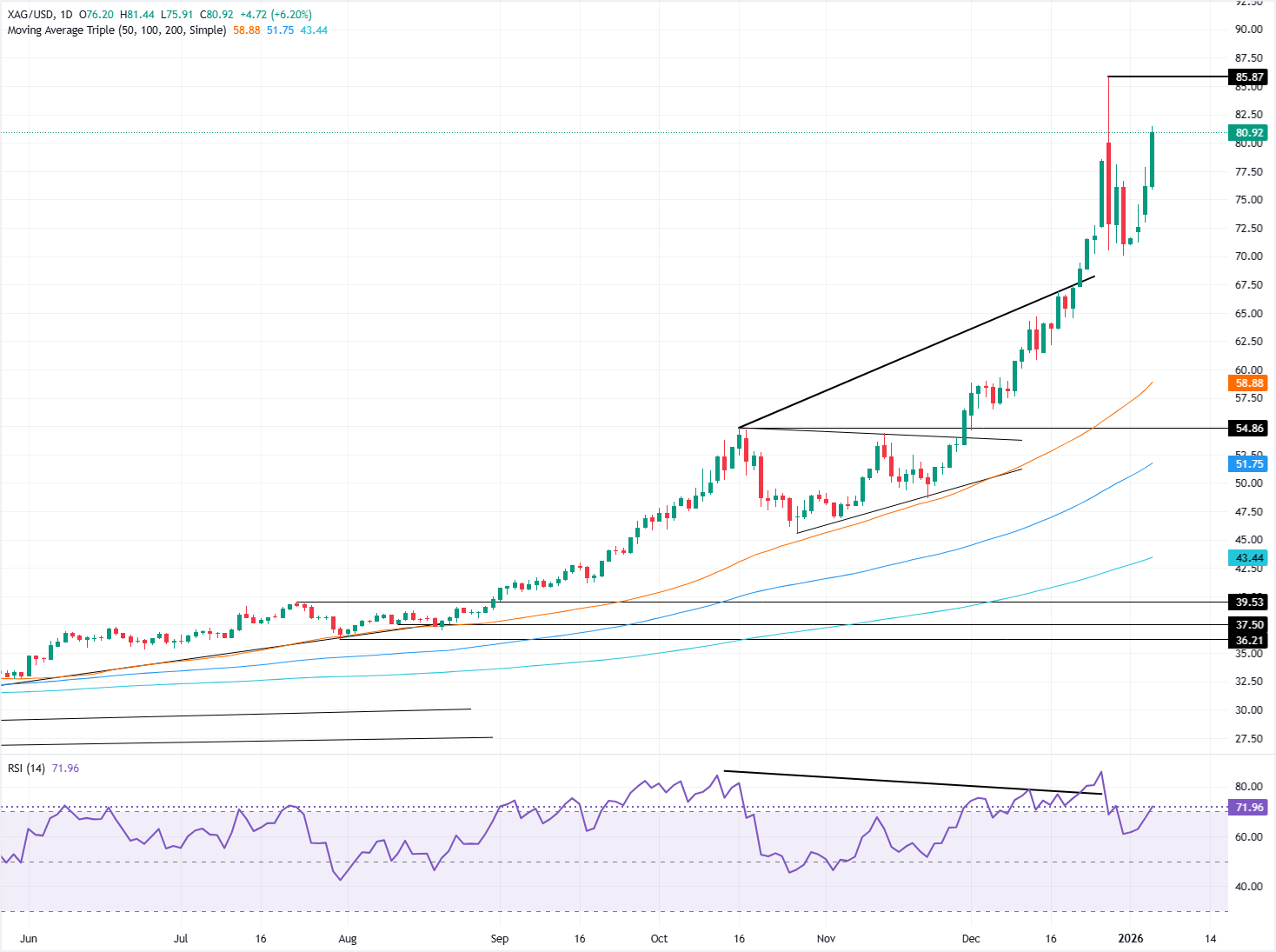 白银(XAG/USD)继续呈抛物缐式上涨,周二上涨超过5%,每盎司交易价格超过80.00美元,侭管美国国债收益率上升和美元强劲。