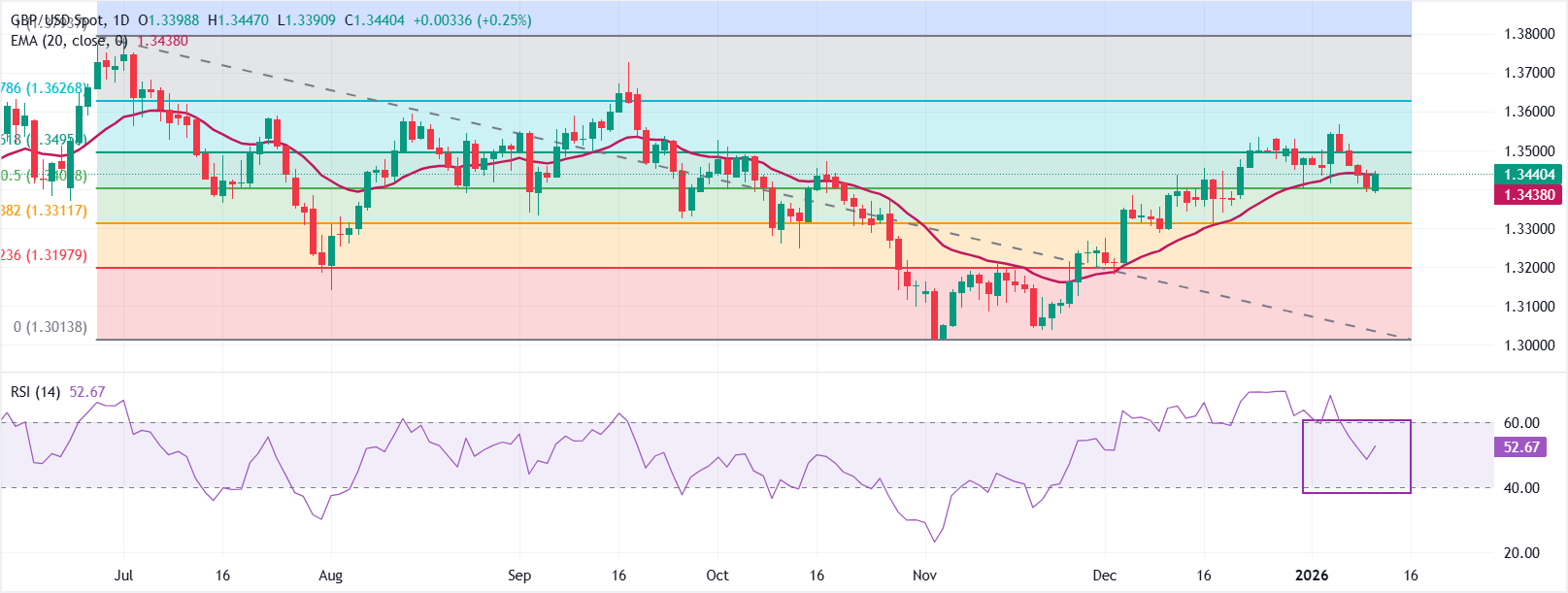 英镑/美元汇率在发稿时交易于约1.3465。20日指数移动平均缐(EMA)上升并位于1.3438,价格刚好在其上方,这支持了看涨的基调。