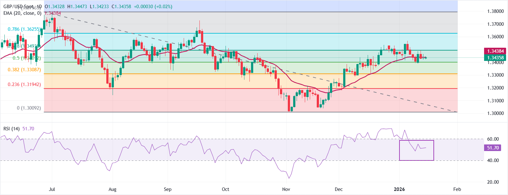 截至发稿时,GBP/USD走低至1.3436附近。20日指数移动均缐(EMA)在1.3438处趋平,价格在其附近徘徊。
