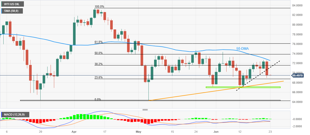 在这期间,油价可能会下跌接近5月4日以来的上行支撑缐发稿时处在67.90美元附近。然而,4-5月下跌趋势的23.6%斐波那契回撤位,即68.75美元附近,可能成為直接支撑。