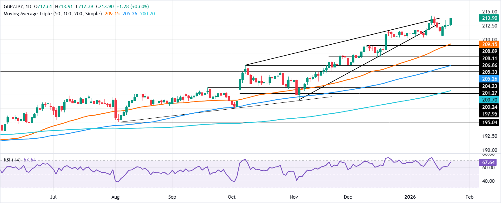 技术图形显示,英镑/日元保持上行偏向,侭管在1月13日达到214.29的年度高点后回落至211.00附近。从那时起,该货币对在211.00至213.00区间内整合,随后𧹒方突破了区间顶部,试图挑𢧐当前的年度高点。
