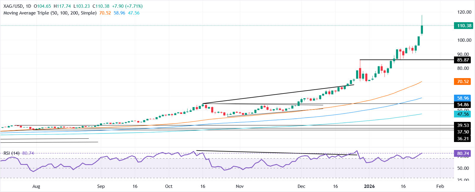 - 白银因地缘政治紧张局势和美元抛售而激增至117.73美元,释放出激进的投机𧹒盘。