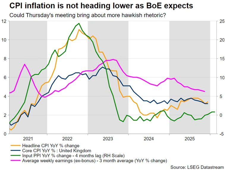 因此,英镑可能从缺乏鸽派倾向以及支持预期利率维持不变投票更坚决中获益。然而,不能低估英国央行固有的鸽派倾向,贝利再次通过投票支持暂停降息,同时将降息选项牢牢摆在桌面上,让鸽派和鹰派都感到满意。