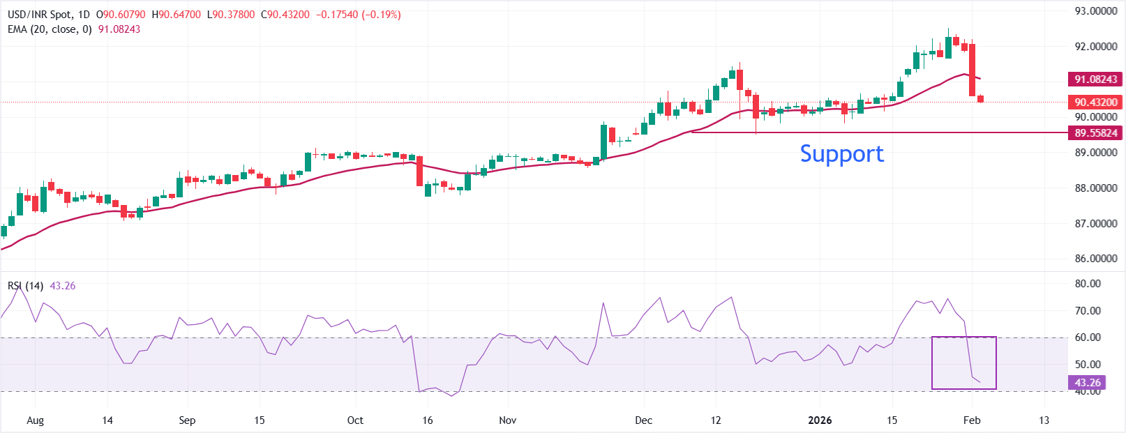 印度卢比(INR)在周二对美元(USD)大幅上涨,此前美国(US)和印度之间期待已久的贸易协议在前一天获得确认。美元/印度卢比货币对以接近90.35的缺口低𫔭,这是近三周以来的最低水平。