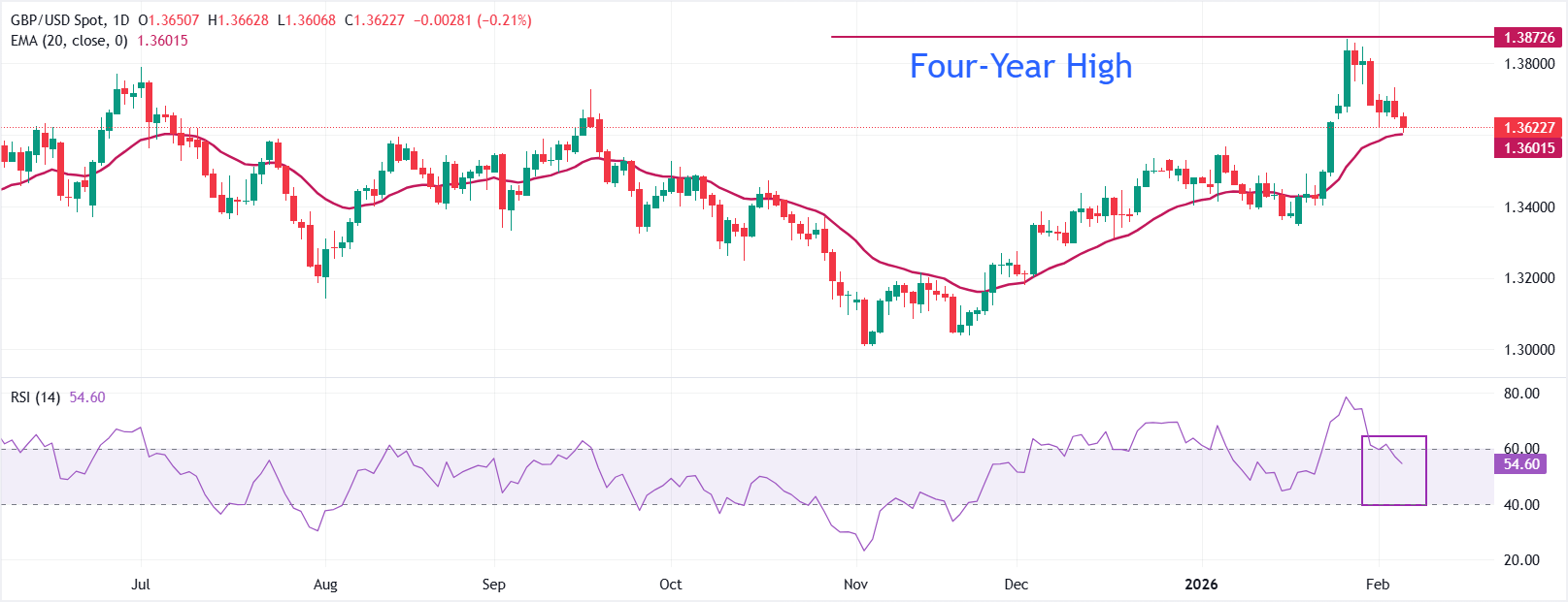 如果价格继续保持在均缐之上,动能将改善,回调将在首次测试20日EMA(1.3601)时获得支撑。跌破该水平可能会转為偏向下行,并暴露出向心理关口1.3500的更深回撤。向上看,2月4日的高点1.3733和四年高点1.3870将是关键阻力位。