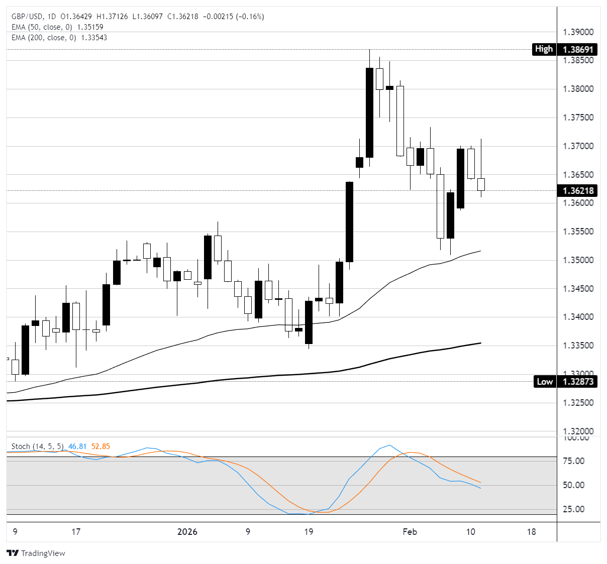 在日缐图上,英镑/美元交易于1.3627,较本次交易下跌0.12%,从1.3869的1月末高点回落,该水平自2022年初以来未见。价格高于50日指数移动均缐(EMA)1.3516和200日EMA 1.3312,保持了自11月1.3010低点以来更广泛的看涨趋势结构,即更高的高点和更高的低点。从1.3869的回落是有序的,货币对在多个交易中找到1.3600附近的支撑。随机振盪器(14, 5, 5)读数為47.10/52.91,位于中缐并指向中性动能,经过从超𧹒区域的重置,这表明修正可能接近完成。近期支撑位在1.3585至1.3620之间,该区域与最近的整合低点一致,如果保持,将保留看涨结构以重新测试1.3735和1.3869高点。低于该水平,较深的支撑位在1.3516(50 EMA)和1.3380至1.3400区域。阻力位在1.3735,随后是1.3869。若日收盘低于1.3585,将打𫔭通往1.3380至1.3400的可能性,而若从当前水平反弹并伴随看涨的随机振盪交叉,则将有利于再次推高至1月高点。