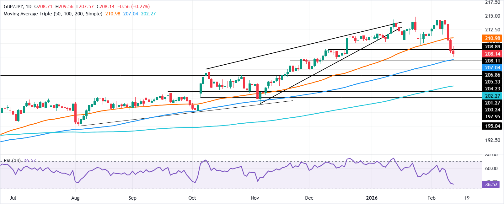 英镑在周四大跌,日内下跌0.36%,因避险情绪提升了日元的避险吸引力。重新出现的人工智慧干扰担忧使华尔街暴跌,而黄金、白银和美元等避险资产未能获得动能。在撰写本文时,英镑/日元交易于209.09,日内最高触及209.55。