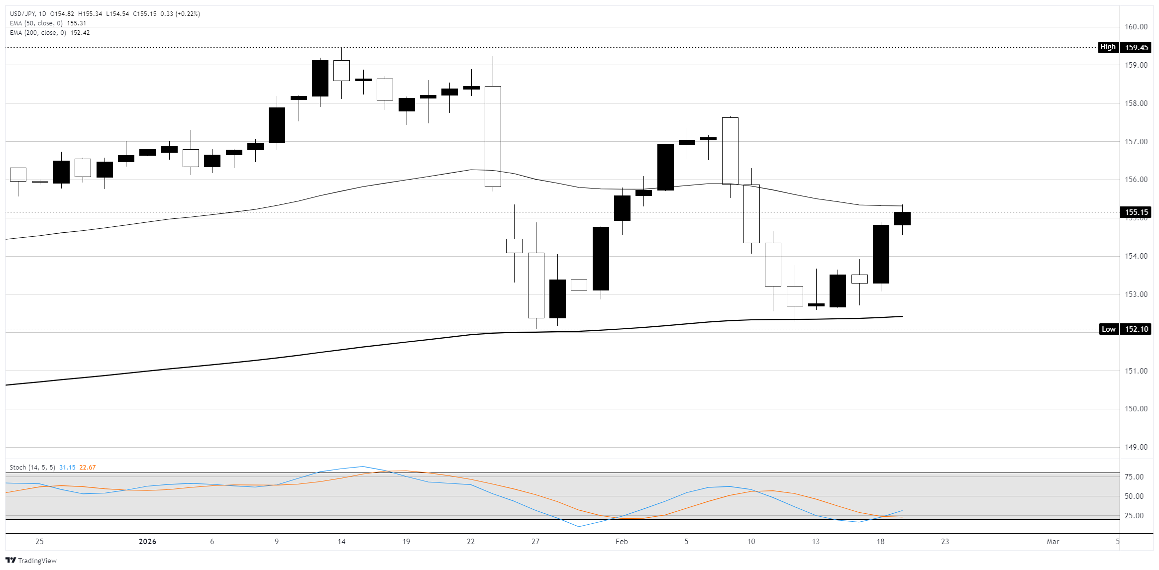 在155.00附近的50日EMA的争夺𢧐