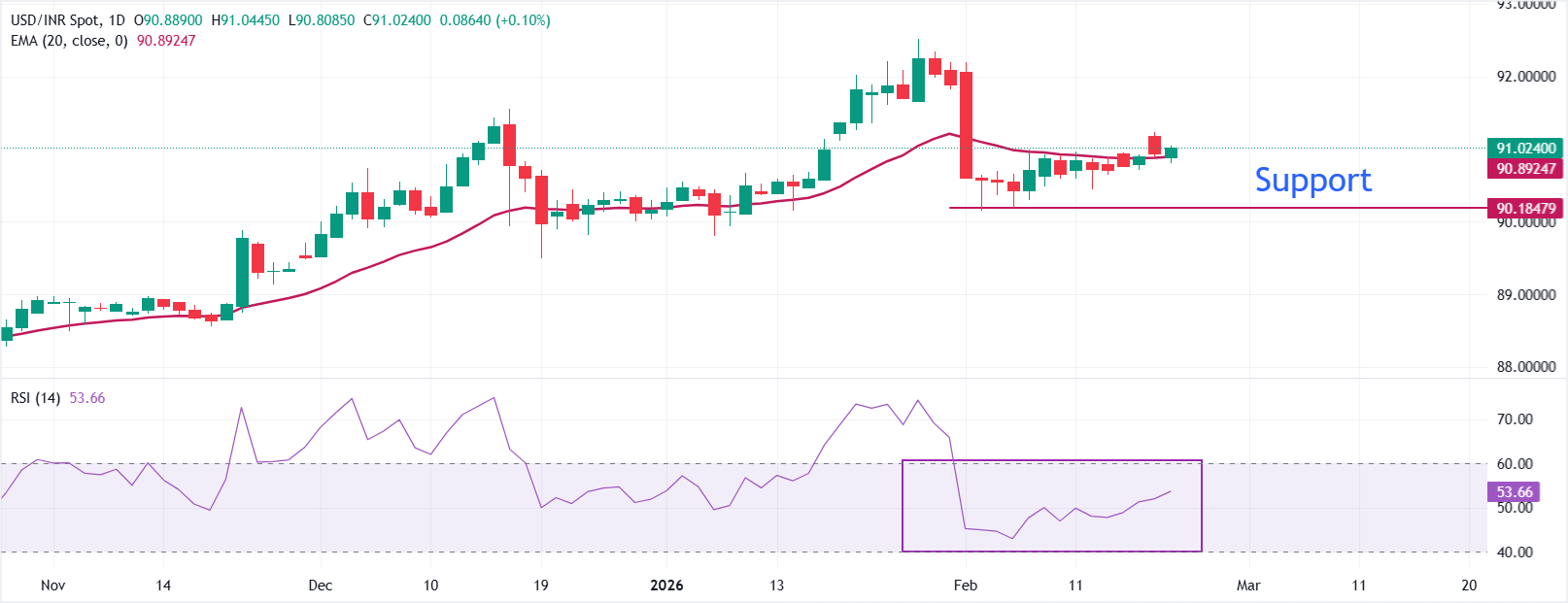 美元/印度卢比在当前时刻上涨至接近91.00。价格保持在90.888的20日指数移动平均缐(EMA)之上,侭管该平均缐在最近的下行后趋于平坦,显示出盘整信号。EMA的轻微上升表明现货下方正在形成初步支撑。