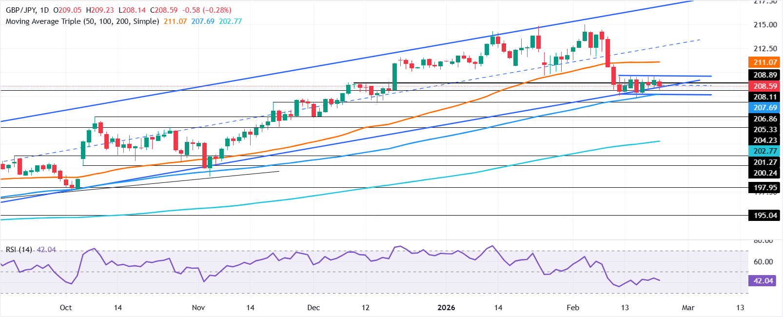 - 英镑/日元在208.00–209.25区间内回落,卖方捍卫短期阻力位。