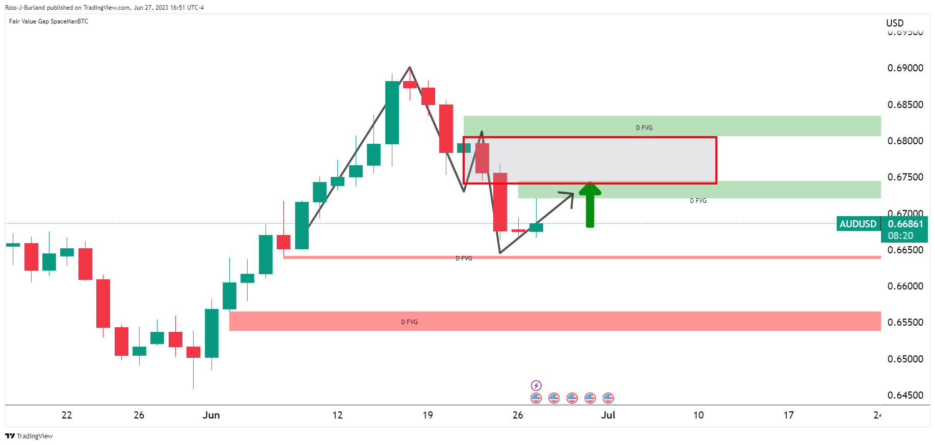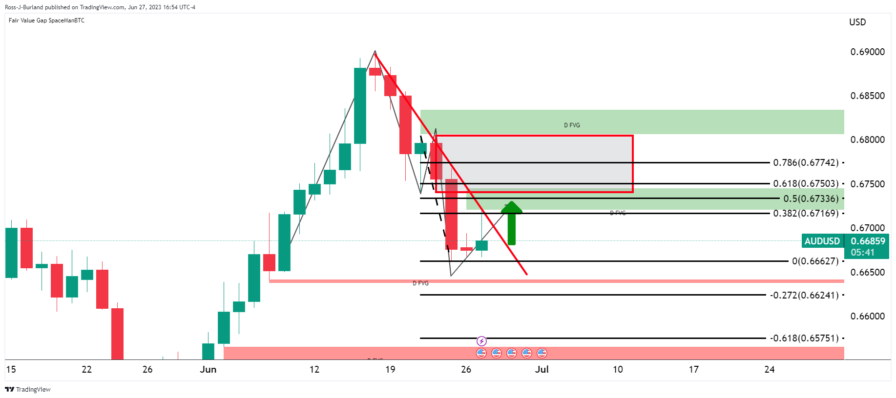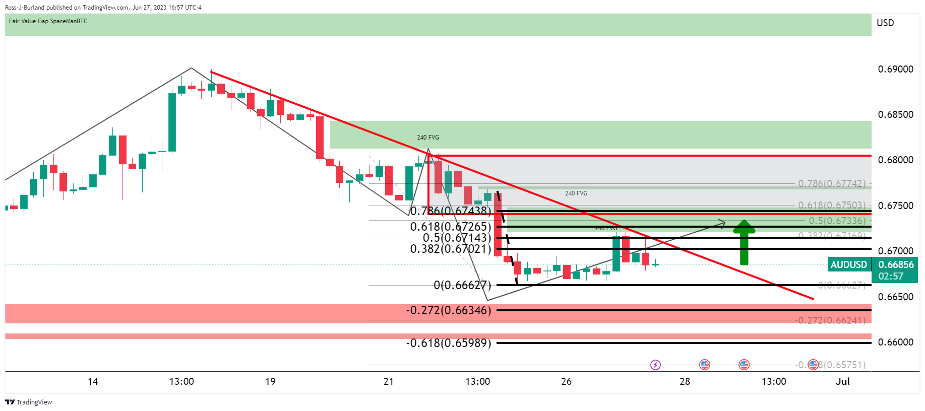 4小时图显示,澳元/美元在接近目标前存在巨大不均衡,但多头将需要首先克服趋势缐阻力。空头正试图在4小时图推动区间最新看跌趋势的50%均值回归水平处试图形成阻力。