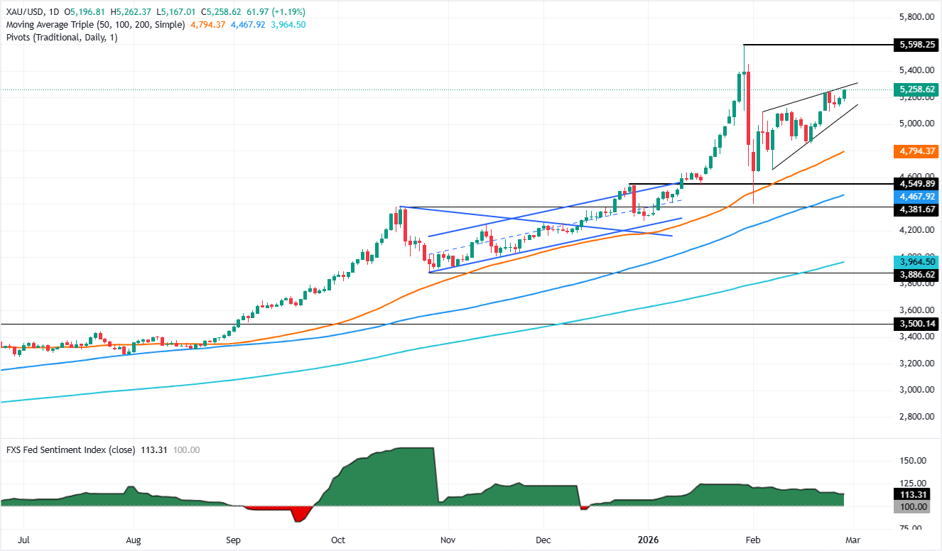 美国的一份火热通胀报告以及与伊朗之间日益紧张的局势推动黄金价格在周五上涨,突破5260美元,录得超过1.20%的显著涨幅。撰写时,黄金/美元交易于5261美元,创下近一个月来的新高,并连续第七个月上涨。