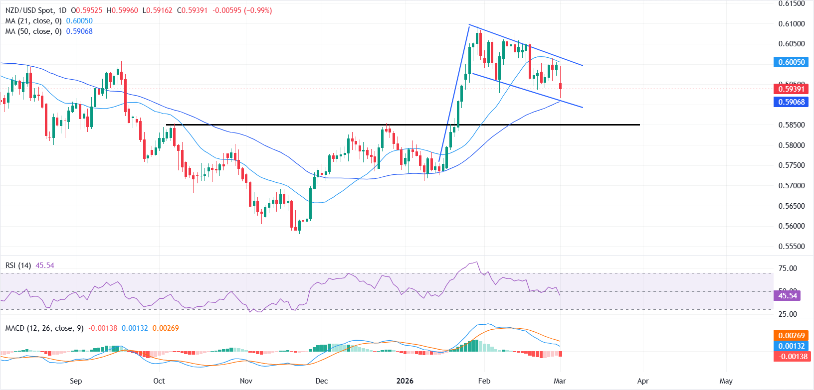 截至撰写时,该货币对交易于0.5939附近,早些时候曾跌至0.5916,為1月23日以来的最低水平。