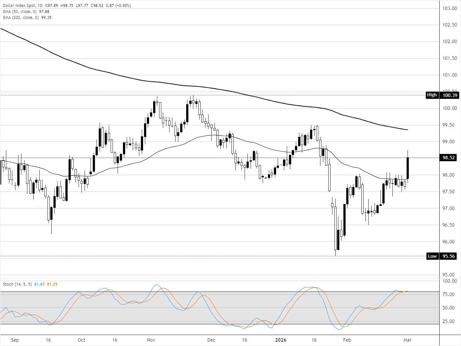 - 由于美国和以色列对伊朗的打击引发市场风险厌恶,美元指数大幅上涨至98.00以上。