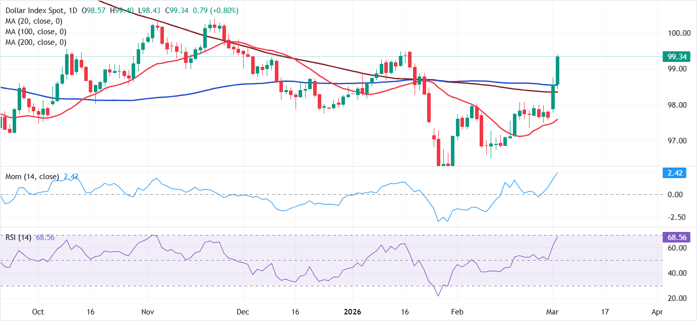 FXStreet首席分析师Valeria Bednarik指出:"对美元的需求推动DXY达到自1月中旬以来的最高点,当时该指数达到99.50。日缐图上的看涨趋势明显,DXY已突破其100日和200日简单移动均缐(SMA),两者在98.40-98.60价格区间内趋于平行。相同的图表显示技术指标坚定向北,处于积极区域,没有上行疲软的迹象。"