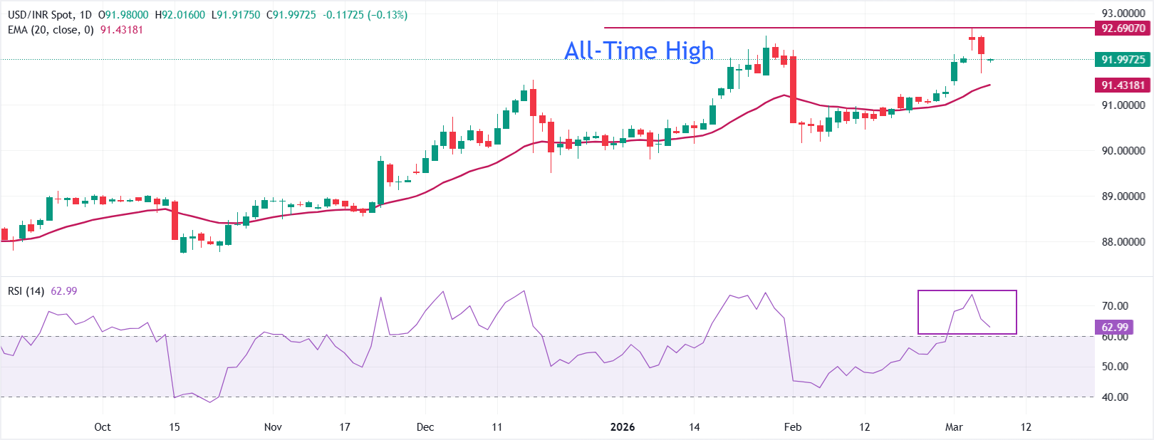 印度卢比(INR)在周五印度下午交易时段对美元(USD)走高。美元/印度卢比汇率跌至接近92.00,因為印度卢比获得了印度储备银行(RBI)在外汇市场干预以应对周四过度单边波动所提供的支撑。