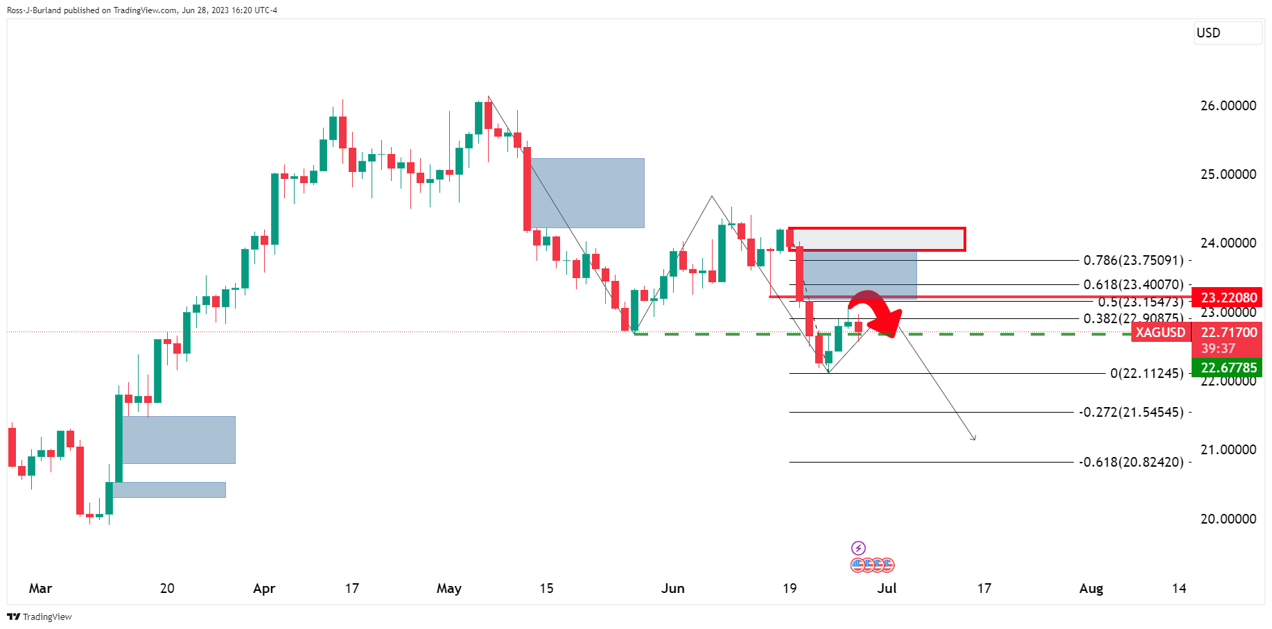 周三银价处于一个十字路口,已经展𫔭整理,接近38.2%菲波纳契位,接近前期低位,银价最新打破看跌推动趋势。以下将按照日图和4小时图分析技术形态波动。