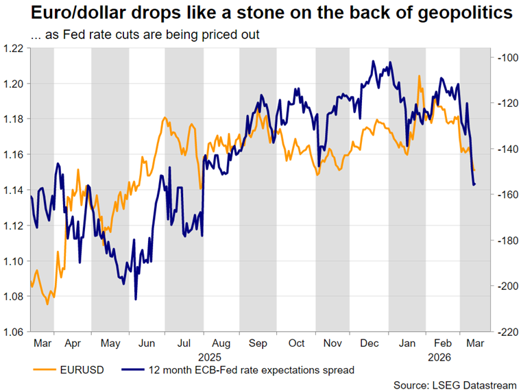 最新的发展完全改变了这两大央行的利率前景。与美联储相比,欧洲央行在此时更关注价格,预计将在2026年收紧货币政策44个基点,而年初仅為4个基点。这一重新定价看起来夸张,并未对欧元提供太多支持,欧元本月对美元下跌2.6%,是自2024年11月以来最强的月度跌幅。