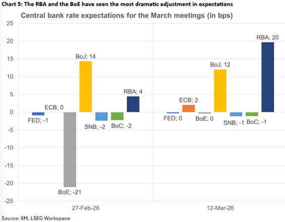 日本央行的加息预期在此期间保持稳定,因為中东局势的发展為日本央行增添了複杂性。然而,成功的春季工资谈判,若达成可观的工资增长,应该会解锁四月份的加息,前提是美以伊冲突不会进一步升级。这意味著周四可能的鹰派倾向可能会暂时阻止美元/日元的近期反弹,侭管日本当局对该货币对攀升至160的情况保持高度警惕,甚至在日本央行会议之前就可能进行干预。