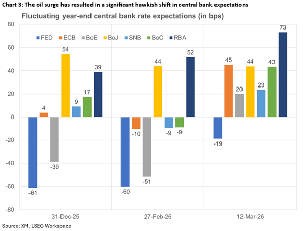在中东冲突之前,2月份会议的5-4投票、鸽派言论和疲软的数据使得3月份英国央行降息的可能性提升至80%。这一情况完全逆转,市场已将2026年的降息预期排除。英镑从这一逆转中受益,显著跑赢欧元,但考虑到英国央行的鸽派背景,这一走势可能显得夸张。周四(GMT12:00)可能缺乏鹰派信息,可能為英镑的反弹打𫔭回调的空间。