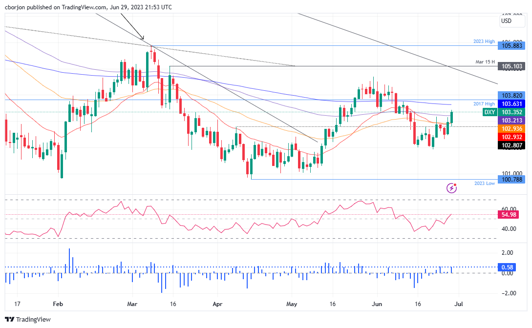 美元指数(DXY)周四上涨0.37%,在美国经济数据验证美联储进一步紧缩政策后,受到美债收益率支撑。因此,美元指数触及两周高点103.437后,交易于103.351。