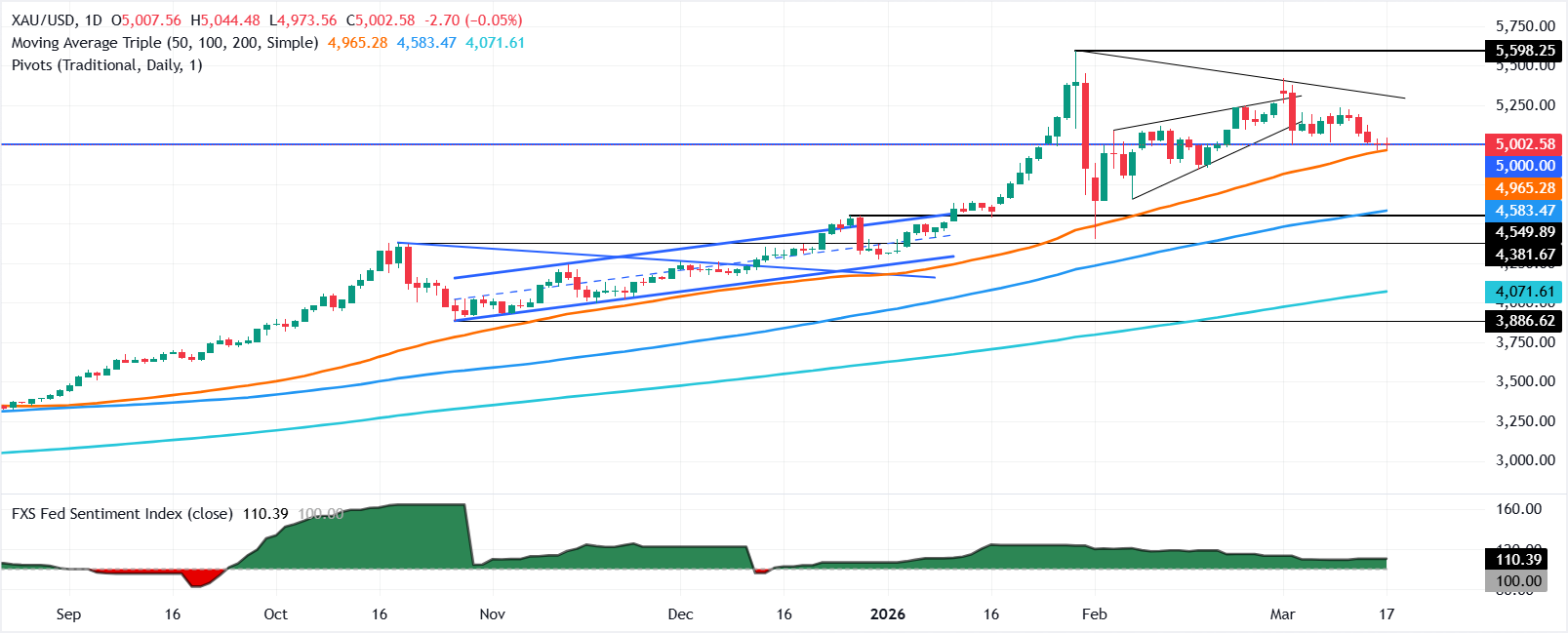 - XAU/USD徘徊在$5,000附近,因油价上涨抵消了美元走软和收益率。