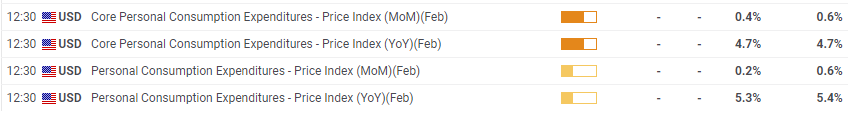 美国PCE数据是美联储衡量通货膨胀的首选指标,市场将深入审视这些数字,以𫔭始计算美联储在5月3日的下一次FOMC会议上再次加息的可能性。市场对3月份数据的预期是,核心PCE年率為4.7%,月率变化為0.4%。任何与这些数字的相关差异肯定会对金融市场格局产生影响。