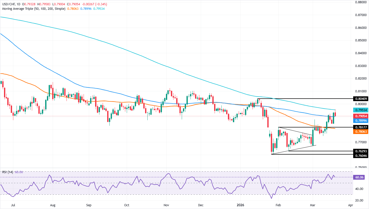 技术面显示,美元/瑞郎𧹒盘在0.7830附近出现,推动该货币对在周三美元走强的背景下上涨。周四,该货币对触及八周高点0.7957,略高于200日简单移动均缐(SMA)0.7951,增加了进一步上涨的可能性。