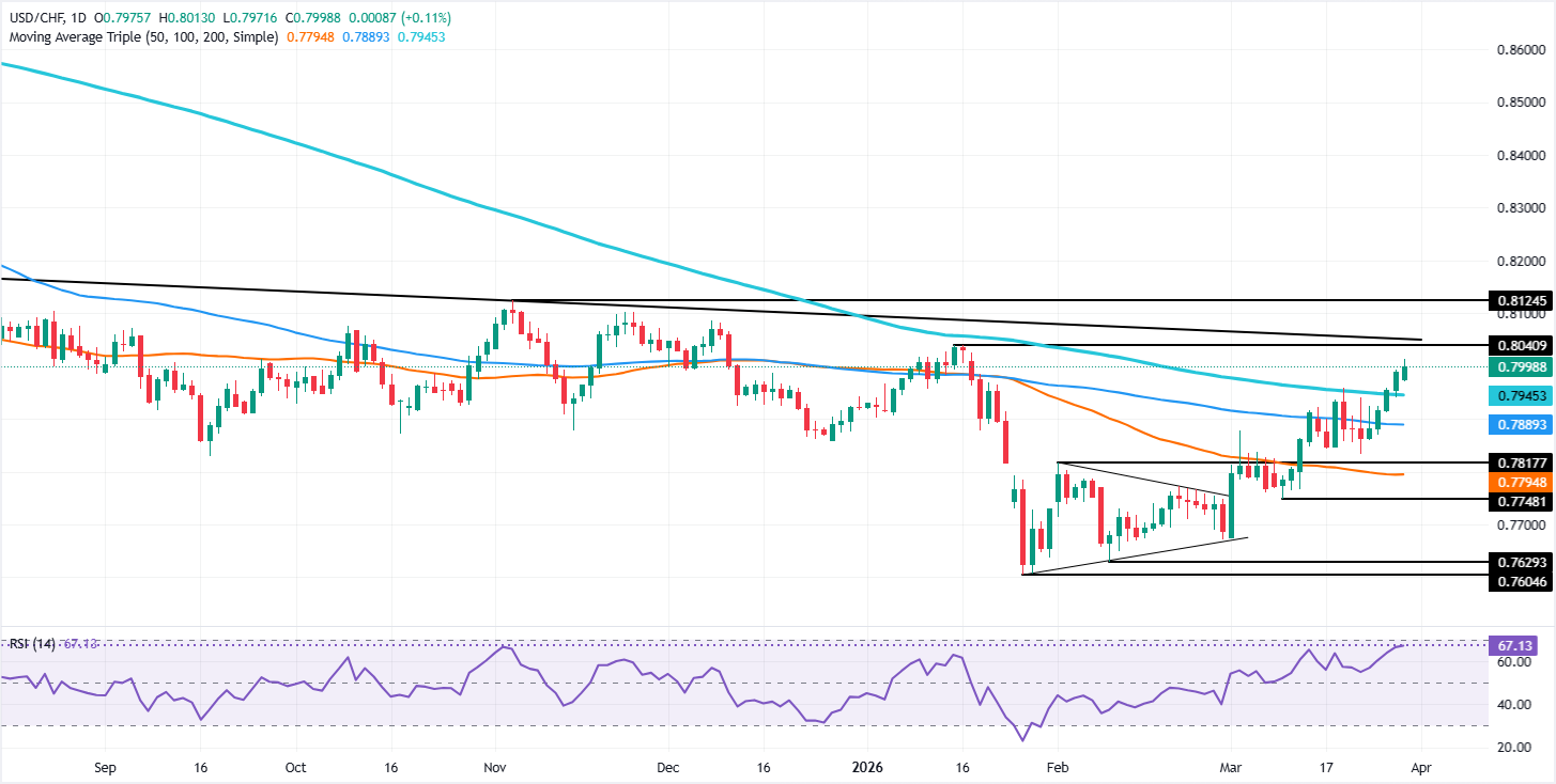 美元/瑞郎连续第五个交易日上涨,涨幅超过0.14%,𧹒家将该货币对推向0.8000,為2026年1月底以来首次。