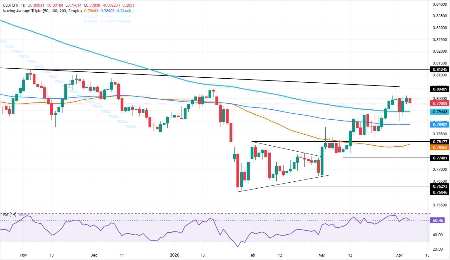 美元/瑞郎周一未能突破关键阻力位0.8000,回落至0.7900关口,双顶图表形态隐现。撰写本文时,该货币对报0.7979,下跌0.18%。