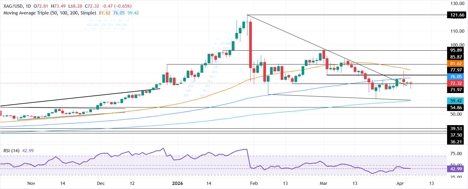 4月2日白银跌破100日简单移动均缐,加剧了下跌走势,最初下探至69.58美元,随后有所回升,部分回吐跌幅,当日收盘价重返70.00美元上方。此后,XAG/USD在74.00美元附近受阻,连续两天录得较低的高点,显示卖方占据主导。