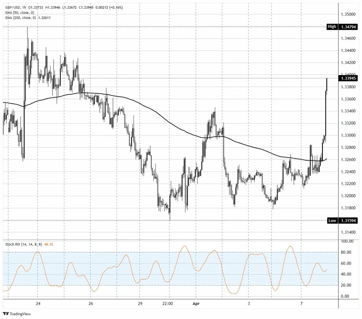 - 英镑/美元在特朗普宣布对伊朗暂停两周军事行动后,跳涨至接近1.3400的盘中高点。