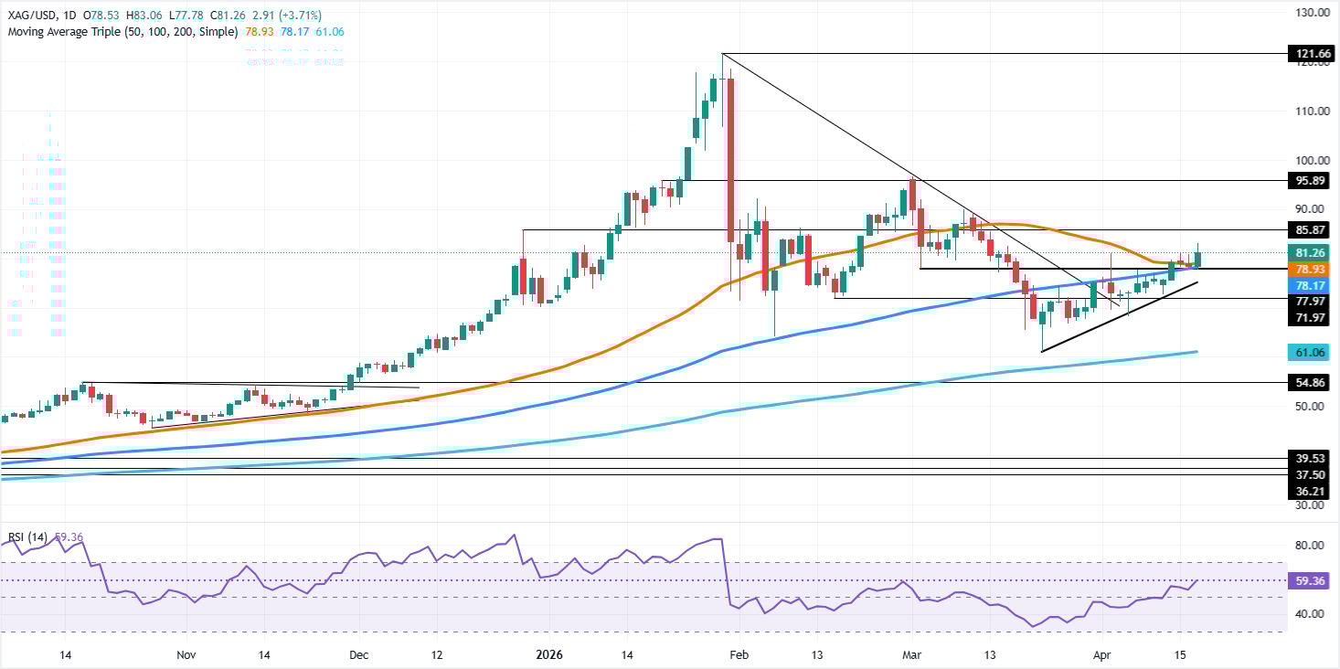 下行方面,若XAG/USD跌破约77.65-77.85美元的关键支撑趋势缐,预计将进一步下跌。下一个支撑位為100日简单移动均缐(SMA)77.24美元,随后是20日SMA 73.77美元。