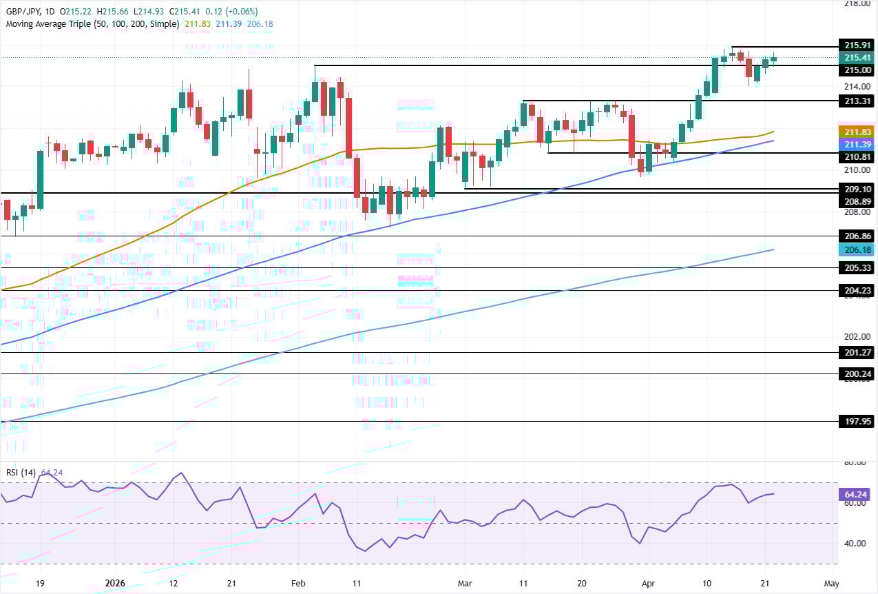 反之,如果英镑/日元跌破215.00,下一个需求区将是周二的日低214.41。若进一步走弱,下一个支撑位将是4月17日的日低214.00,随后是位于213.25的20日简单移动平均缐(SMA)。
