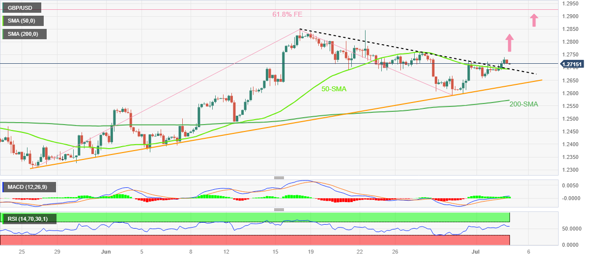 侭管英镑/美元震盪,或者说缺乏看涨动能,但多头仍占据主导,原因是英镑/美元突破了关键阻力汇合点现在的支撑,该水平汇合50简单移动均缐和6月16日以来的下行趋势缐1.2690附近。