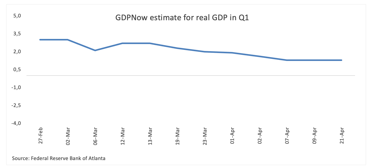 亚特兰大联储的GDPNow模型因其实时追踪经济活动而备受关注,截至4月21日的更新预测第一季度GDP增长1.2%(此前4月9日為1.3%)。